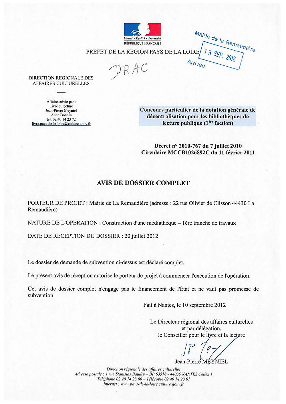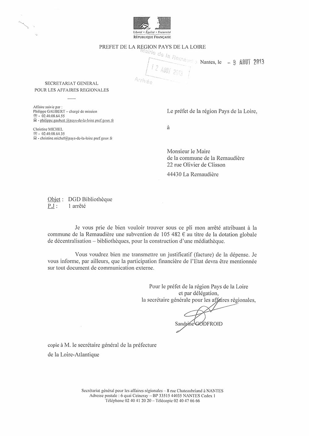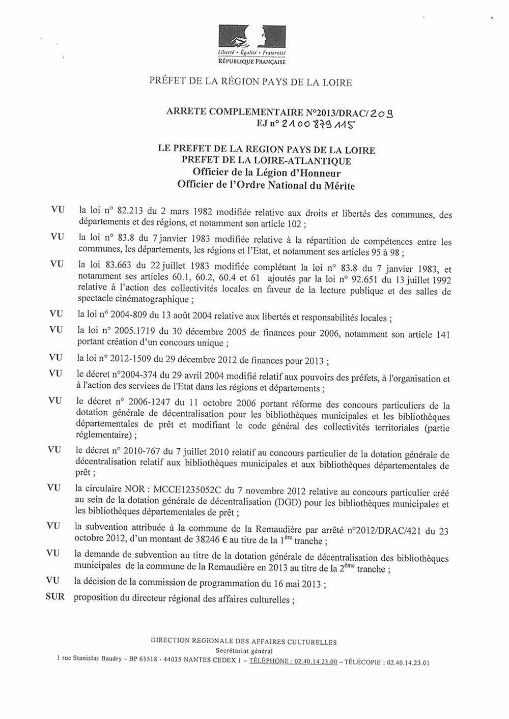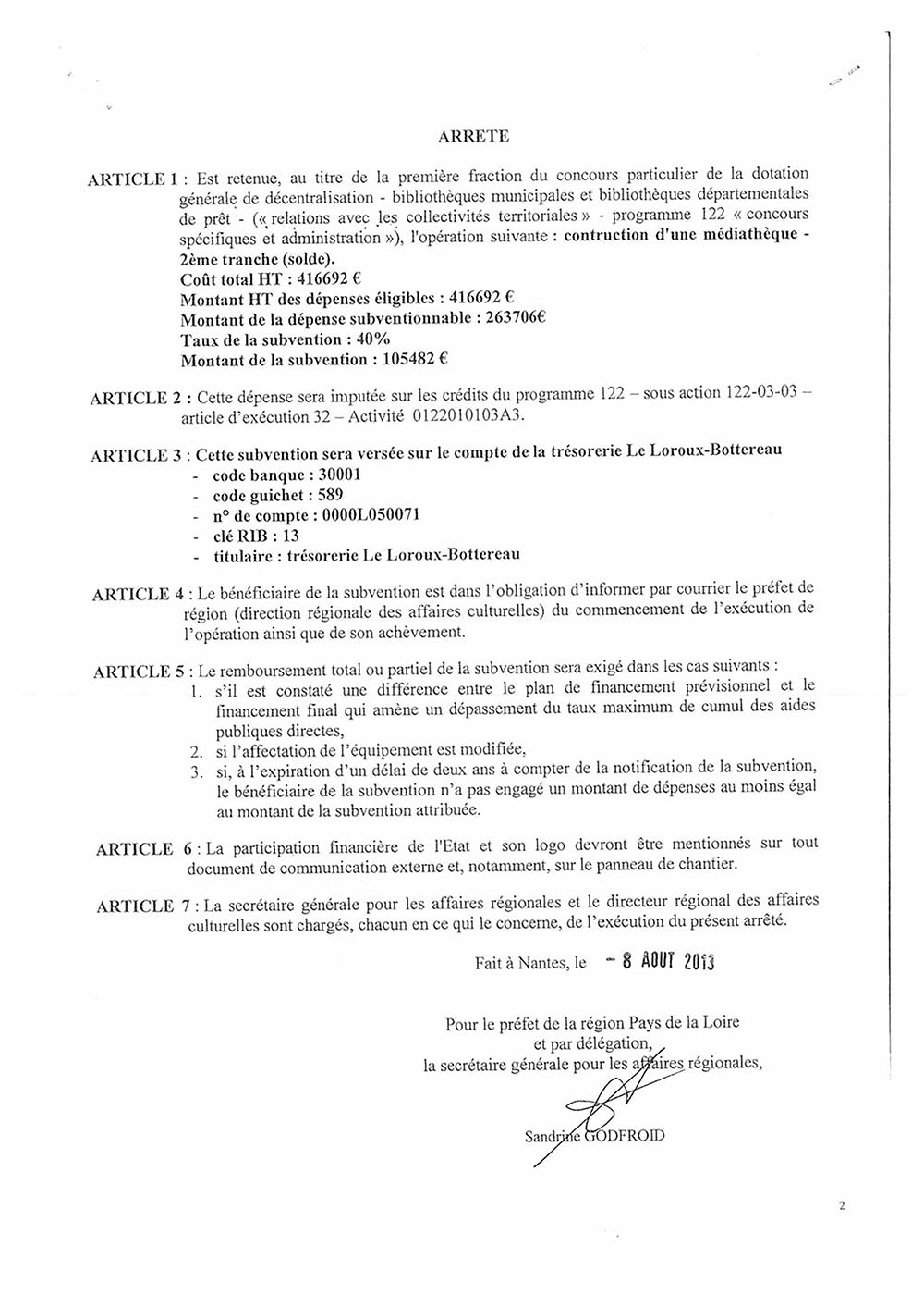 Arrêté du Préfet attribuant une subvention de 105 482 € DGD pour la médiathèque 15 novembre 2018 Préfecture DRAC [PDF]