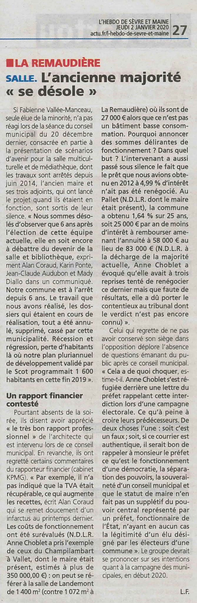 Pourtant absents de la soirée, ils disent avoir apprécié « le très bon rapport professionnel » de l’architecte qui est intervenu lors de ce conseil municipal. En revanche, ils ont regretté certains commentaires du rapporteur financier (cabinet KPMG). « Par exemple, il n’a pas indiqué que la TVA était récupérable, ce qui augmente les recettes, écrit Alan Coraud qui se remet doucement d’un infarctus au printemps dernier. Les coûts de fonctionnement ont été surévalués (N.D.L.R. Anne Choblet a pris l’exemple de ceux du Champilambart à Vallet, dont le maire était présent, estimés à plus de 350 000,00 : on peut se référer à la salle de Landemont de 1 400 m2 (contre 1 072 m2 à La Remaudière) où ils sont de 27 000 alors que ce n’est pas un bâtiment basse consommation. Pourquoi annoncer des sommes délirantes de fonctionnement ? Dans quel but ? L’intervenant a aussi passé sous silence le fait que le prêt que nous avions obtenu en 2012 à 4,99 % d’intérêt n’ait pas été renégocié. Au Pallet (N.D.L.R. dont le maire était présent), la commune a obtenu 1,64 % sur 25 ans, soit 25 000 par an de moins d’intérêt à rembourser amenant l’annuité à 58 000 au lieu de 83 000 € (N.D.L.R. à la décharge de la majorité actuelle, Anne Choblet a évoqué qu’elle avait à trois reprises tenté de renégocier ce dernier mais que faute de résultats, elle a dû porter le contentieux au tribunal dont le verdict n’est pas encore connu) ».